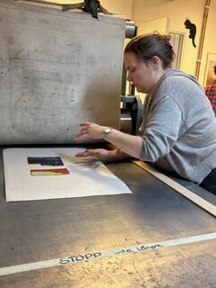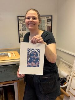 Nina lär ut den grafiska tekniken linoleumsnitt genom pusselmetoden